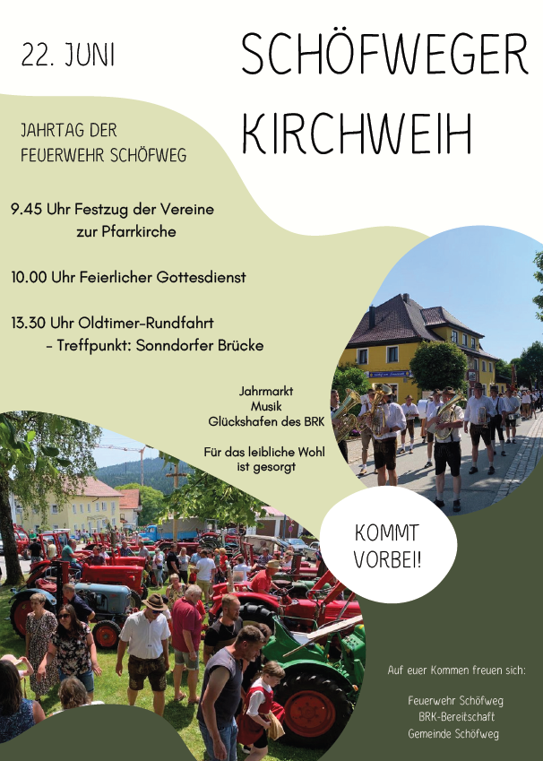 Traditionelle Kirchweih mit Festzug, Gottesdienst, Oldtimer-Rundfahrt, Musik und Jahrmarkt.