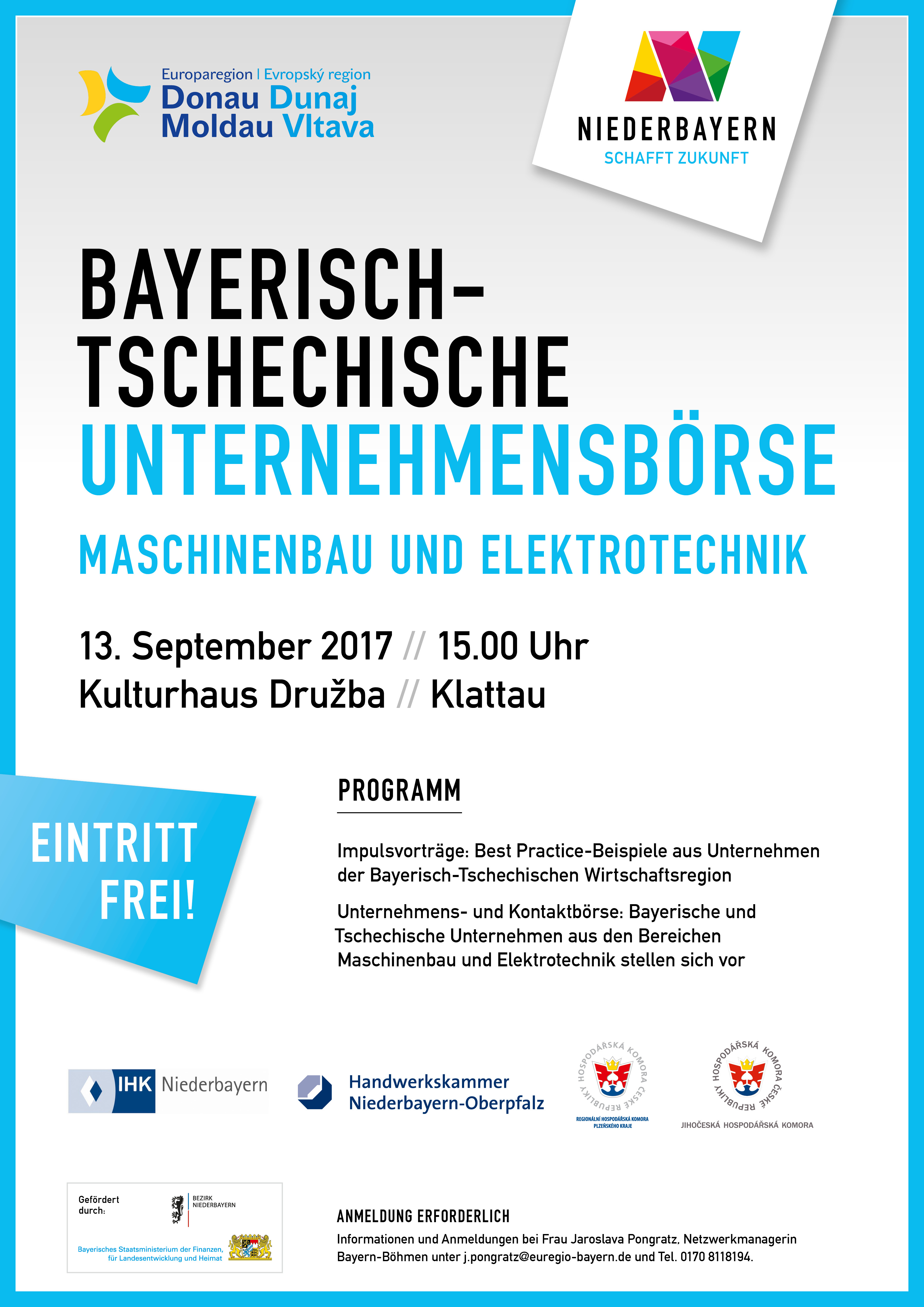 Die wirtschaftliche Zusammenarbeit zwischen Bayern und Tschechien hat sich kontinuierlich fortentwickelt und hat bereits ein hohes Niveau erreicht. Viele erfolgreiche Kooperationen zwischen Unternehmen in unseren Regionen haben zur Stärkung der Wettbewerbsfähigkeit auf beiden Seiten beigetragen. Dennoch bietet eine noch engere Zusammenarbeit durchaus erhebliche Potenziale. Wichtige Voraussetzung ist ein persönliches Kennenlernen von möglichen Partnern. Diese Gelegenheit möchten Ihnen die Veranstalter der Unternehmensbörse bieten. Wir würden uns freuen, Sie zu dieser kostenfreien Veranstaltung in Klattau begrüßen zu können.